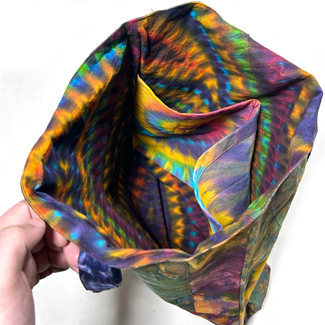 表面にタイダイをパッチワークし、表裏中と様々な表情のタイダイを楽しめるアーティスティックな作品です。