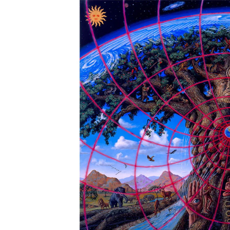 左側には、守るべき価値のあるすべてのもの――驚くべき生命に満ちた自然の美しさが描かれている。この樹は、亜原子、原子、分子、そして細胞レベルの物質に根を下ろし、そこから海、岩石、土壌、草、森林、山々、湖、川、空気、そしてすべての植物と生き物を育む大気へと向かって、上方へと伸びている。
